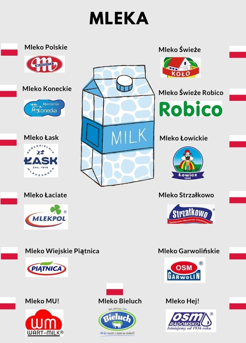 W przypadku tej kategorii skupiliśmy się na dwóch typach produktów, których używa się praktycznie w każdym polskim domu. Mowa o mleku i produktach do smarowania, jak masło czy margaryna. Okazuje się, że w przypadku mlek możemy wybierać tak naprawdę głównie z polskich produktów. Jest to kategoria, w której królują krajowi giganci, jak Mlekovita (największa grupa mleczarska w Europie Środkowo-Wschodniej), Mlekpol czy OSM Łowicz.