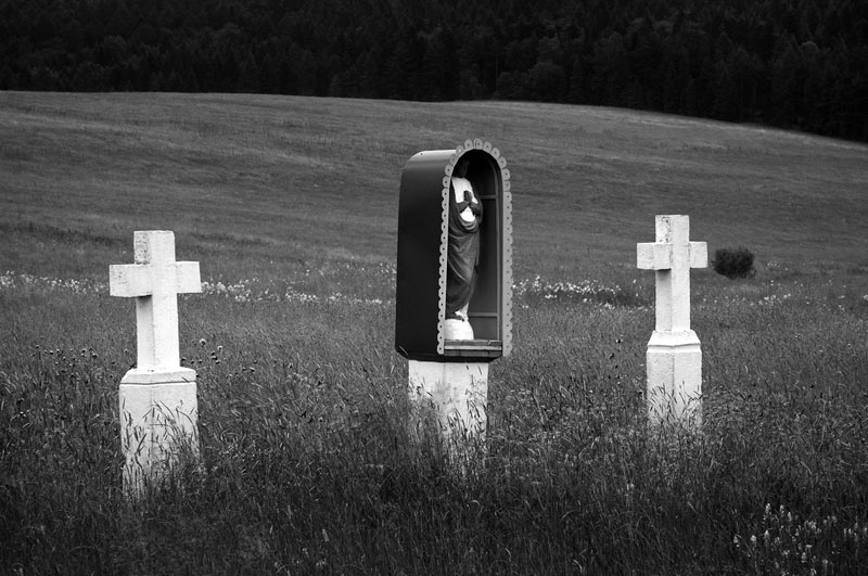 „Łemkowyna" to podróż w głąb historii i po obszarach współczesności. Wybijającym się elementem, obecnym na co trzeciej z prezentowanych fotografii jest krzyż. Krzyż ma znaczenie wielorakie, jest oczywiście symbolem śmierci, ale także odradzającego się życia i nadziei. Prawosławny krzyż Łemków - trzybelkowy, jak pisał Petro Murianka „ rozpięty na siedem stron świata z krzykiem wiatru w drzazgach (...)" jest kotwicą łemkowskiej tożsamości narodowej, świadectwem przynależności do ziemi, pamięcią zbiorową, rękojmią dziedzictwa. Dlatego, nierzadko ukwiecony, zadbany i otoczony prowizorycznym płotkiem, traktowany jest jak unikatowe, drogocenne dzieło chronione w depozycie muzealnym.