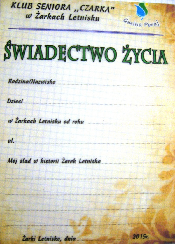 Są jeszcze dostępne ŚWIADECTWA ŻYCIA, które będzie można zamknąć na 100 lat w Kapsule Czasu. Można je nabyć w Klubie Seniora „Czarka” w poniedziałki i czwartki w godz.10-12. Osoby, które nie mogą tego uczynić a chcą by ich potomkowie kiedyś się o nas coś dowiedzieli mogą nabyć taki dokument bezpośrednio u członków zarządu lub dzwoniąc pod nr.504 870 520 lub 607 913 272.
