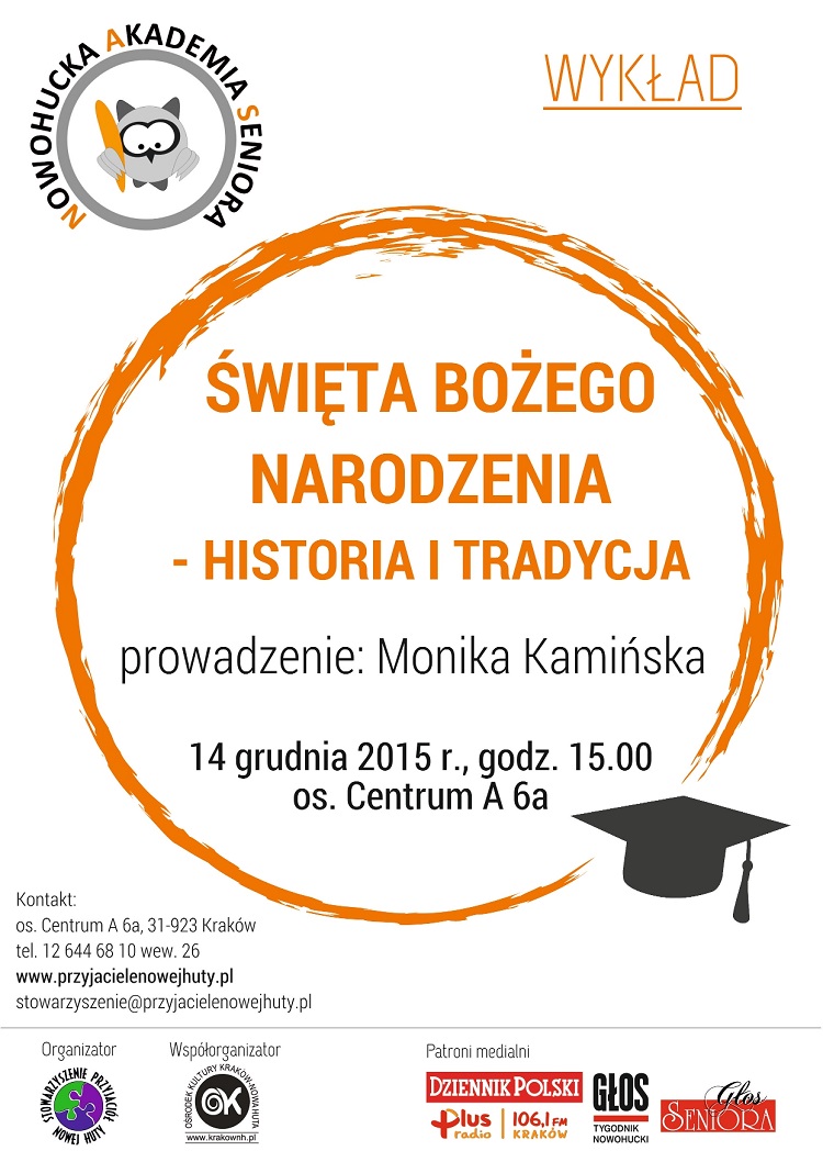 Podczas wykładu poruszone zostaną zagadnienia dotyczące historii i tradycji związanych z obchodami Świąt Bożego Narodzenia. Wykład poprowadzi Monika Kamińska, absolwentka studiów doktoranckich na Uniwersytecie Jagiellońskim, z wykształcenia archeolog. Zapraszają: Stowarzyszenie Przyjaciół Nowej Huty oraz Ośrodek Kultury Kraków-Nowa Huta.