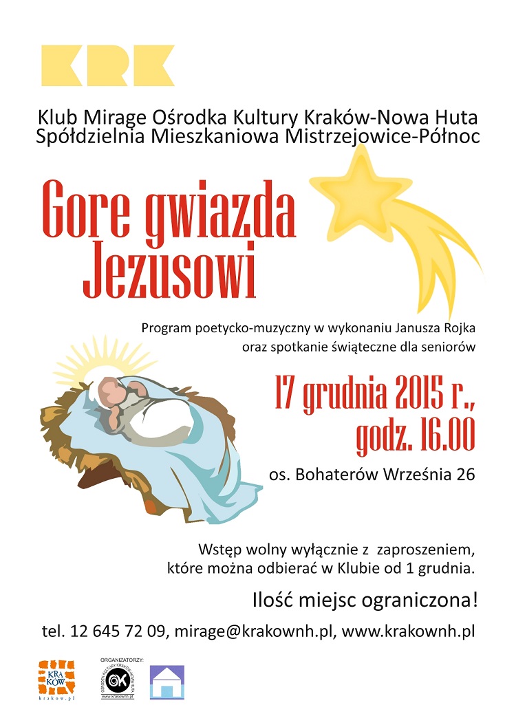 17.12. GODZ. 16.00, GORE GWIAZDA JEZUSOWI… Klub Mirage Ośrodka Kultury Kraków-Nowa Huta (os. Bohaterów Września 26)