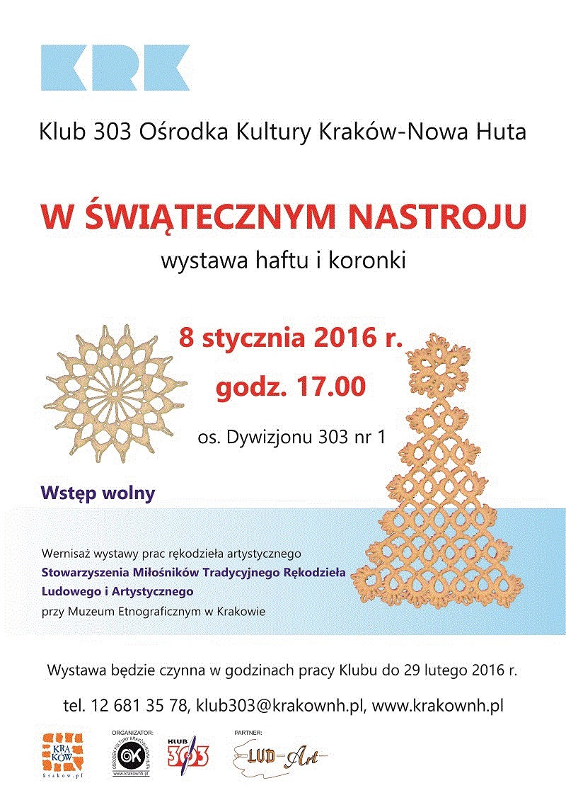 8.01. GODZ. 17.00, W ŚWIĄTECZNYM NASTROJU - WYSTAWA KORONKI I HAFTU Klub 303 Ośrodka Kultury Kraków-Nowa Huta Wernisaż wystawy rękodzieła artystycznego (hafty: płaskie,