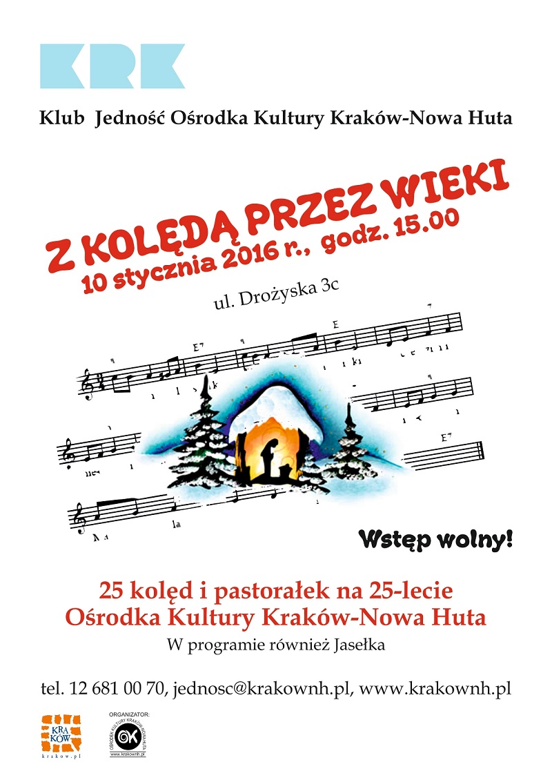 Jak co roku, Klub Jedność zaprasza wszystkich do wspólnego kolędowania. Program słowno-muzyczny przygotują uczniowie ze Szkoły Podstawowej nr 142. Zaprzyjaźnione zespoły z Ośrodka Kultury Kraków-Nowa Huta oraz z sąsiadujących osiedli nowohuckich zaprezentują dwadzieścia pięć kolęd i pastorałek na 25-lecie Ośrodka Kultury Kraków-Nowa Huta.