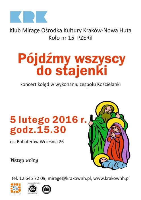 Wspólne kolędowanie to piękna polska tradycja. Kolęda jest niezwykle cennym, bo zawierającym proste prawdy utworem, który otwiera nas na tajemnice narodzin Chrystusa. By nie zapomnieć o tej tradycji Klub Mirage wraz z PZERiI zapraszają na koncert kolęd w wykonaniu zespołu Kościelanki. Usłyszymy najpiękniejsze polskie kolędy i pastorałki, które sprawią, że powrócimy jeszcze na chwilę w magiczny klimat świąt Bożego Narodzenia i pożegnamy się z nim do następnego roku.