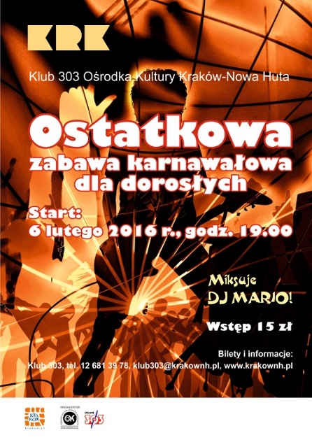 6.02. GODZ. 19.00, OSTATKOWA ZABAWA KARNAWAŁOWA DLA DOROSŁYCH Klub 303 Ośrodka Kultury Kraków-Nowa Huta (os. Dywizjonu 303 nr 1) Tradycyjna ostatkowa zabawa na zakończenie karnawału dla dorosłych przy muzyce elektronicznej. Zabawa prowadzona przez DJ Mario gwarantuje wysoki poziom rozrywki, pełnej humoru i karnawałowej energii. Zapraszamy serdecznie. Wstęp: 15 zł
