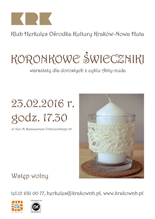 23.02. GODZ. 17.30, KORONKOWE ŚWIECZNIKI - WARSZTATY DLA DOROSŁYCH Z CYKLU ANTY-NUDA – B Klub Herkules Ośrodka Kultury Kraków-Nowa Huta (ul. Gen. M. Karaszewicza-Tokarzewskiego 29) Klub Herkules zaprasza na kolejne warsztaty dla dorosłych z cyklu Anty-nuda. Masz wolny czas? Przyjdź do nas! Podczas warsztatów nauczymy się jak wykonać koronkowe świeczniki, wykorzystując do tego serwetki.