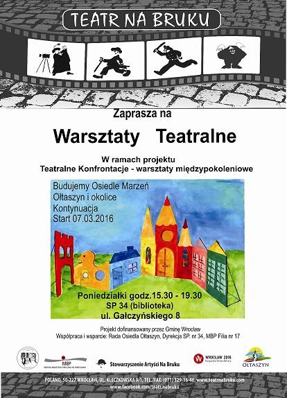 Warsztaty Teatralne w ramach projektu: „Teatralne konfrontacje - warsztaty międzypokoleniowe” Kiedy: Poniedziałki: 15:30 – dzieci, 17.30 - dorośli , pierwsze spotkanie 07.03.2016 Gdzie: Miejska Biblioteka Publiczna we Wrocławiu, Filia nr 17 przy Szkole Podstawowej nr 34 ul. Gałczyńskiego 8 Kto: Teatr Na Bruku, Stowarzyszenie „Artyści Na Bruku” Zapraszamy do wspólnej zabawy z Teatrem Na Bruku!