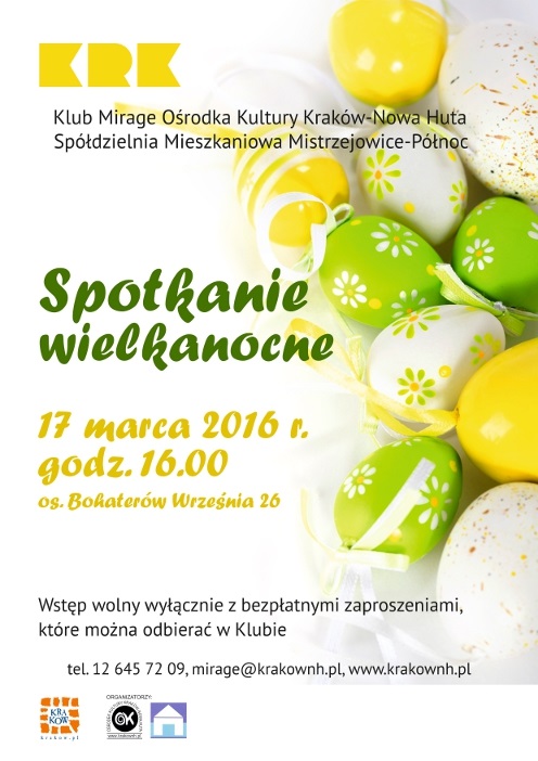 17.03. GODZ. 16.00, SPOTKANIE WIELKANOCNE Klub Mirage Ośrodka Kultury Kraków-Nowa Huta (os. Bohaterów Września 26)