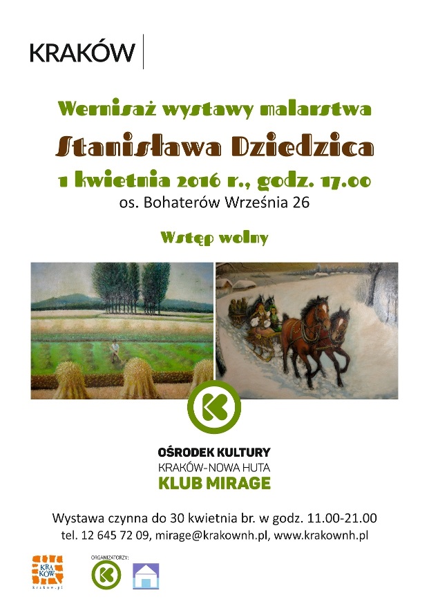 Zapraszamy na wernisaż wystawy malarstwa Stanisława Dziedzica - 77-letni mieszkańca Nowej Huty. Twórca-amator. Posiada wiele pasji, jak lekkoatletyka, motoryzacja,