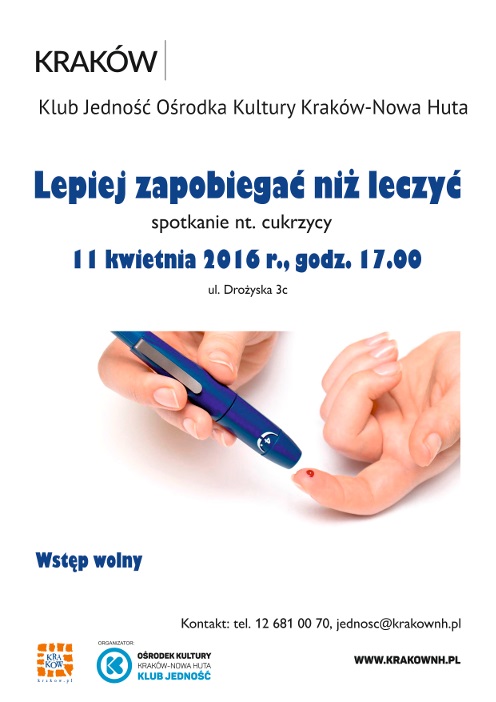 11.04., GODZ. 17.00, LEPIEJ ZAPOBIEGAĆ NIŻ LECZYĆ Klub Jedność Ośrodka Kultury Kraków-Nowa Huta (ul. Drożyska 3c)