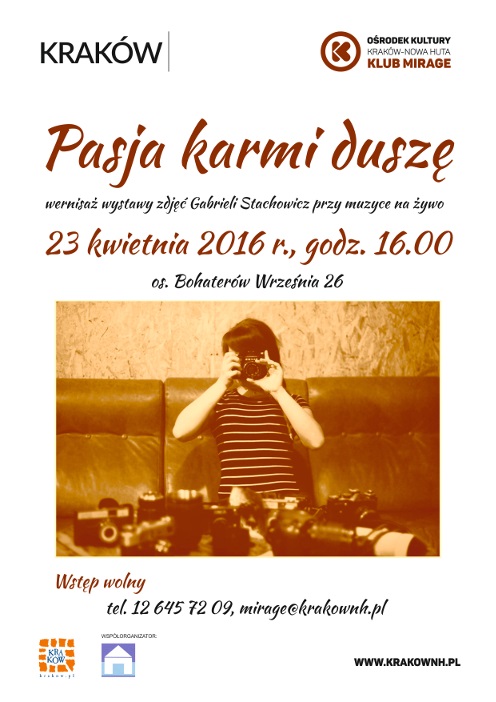 23.04., GODZ. 16.00, WERNISAŻ WYSTAWY FOTOGRAFII GABRIELI STACHOWICZ PASJA KARMI DUSZĘ Klub Mirage Ośrodka Kultury Kraków-Nowa Huta (os. Bohaterów Września 26) Wernisaż wystawy fotografii Gabrieli Stachowicz, młodej krakowskiej artystki, która fotografuje praktycznie od dziecka. Pasję zaszczepiła w niej jej mama, która również nie roztaje się z aparatem fotograficznym. Gabriela na swoich zdjęciach uwiecznia przede wszystkim ludzi, ich niesamowite emocje, przeżycia, nastroje.
