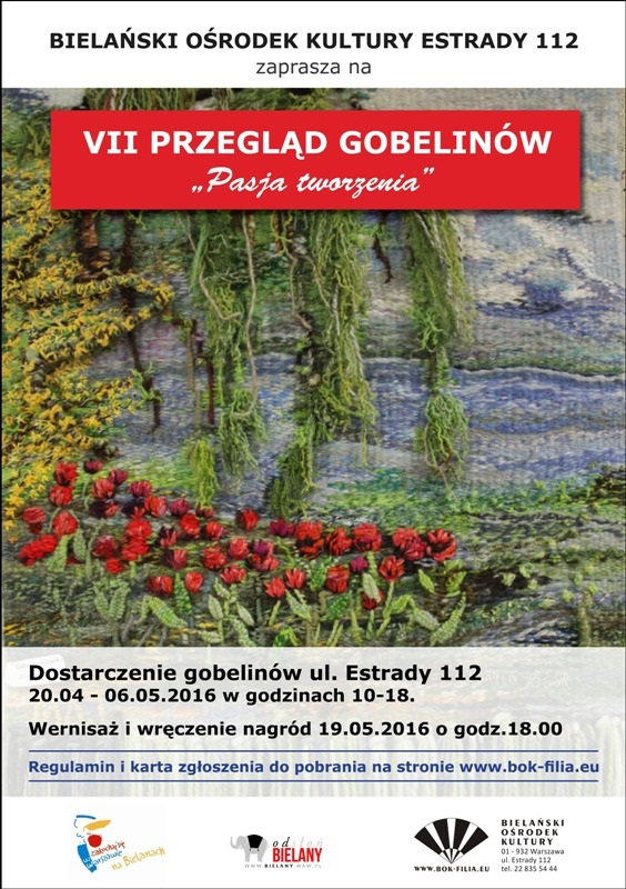 Zapraszamy wszystkie osoby, które amatorsko zajmują się tkaniem gobelinów do wzięcia udziału w VII Przeglądzie Gobelinów „Pasja Tworzenia” organizowanym przez Bielański Ośrodek Kultury „Estrady 112”.