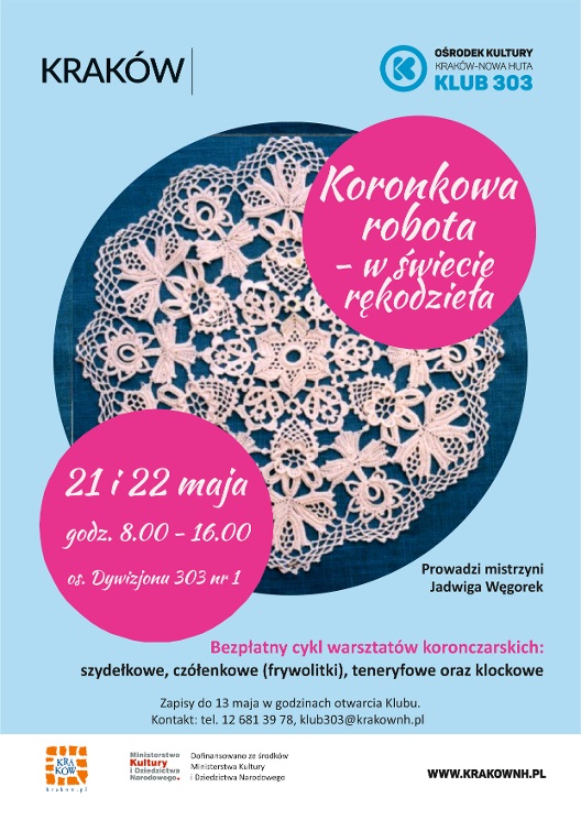 Warsztaty rozpoczną się w maju i potrwają do grudnia. Zostaną zakończone uroczystą wystawą oraz wręczeniem dyplomów. Spotkania będą odbywały się cyklicznie po 10 godzin w miesiącu. Ze względu na stopień trudności tworzonych podczas warsztatów koronek, projekt jest dedykowany dla odbiorców dorosłych, jak też dla starszej młodzieży. Zapisy do 13 maja w Klubie 303.