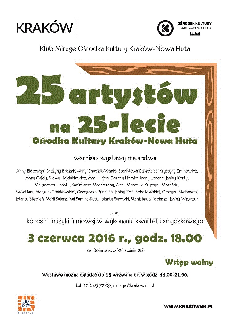 3.06. GODZ. 18.00, 25 ARTYSTÓW NA 25-LECIE OK Klub Mirage Ośrodka Kultury Kraków-Nowa Huta (os. Bohaterów Września 26)