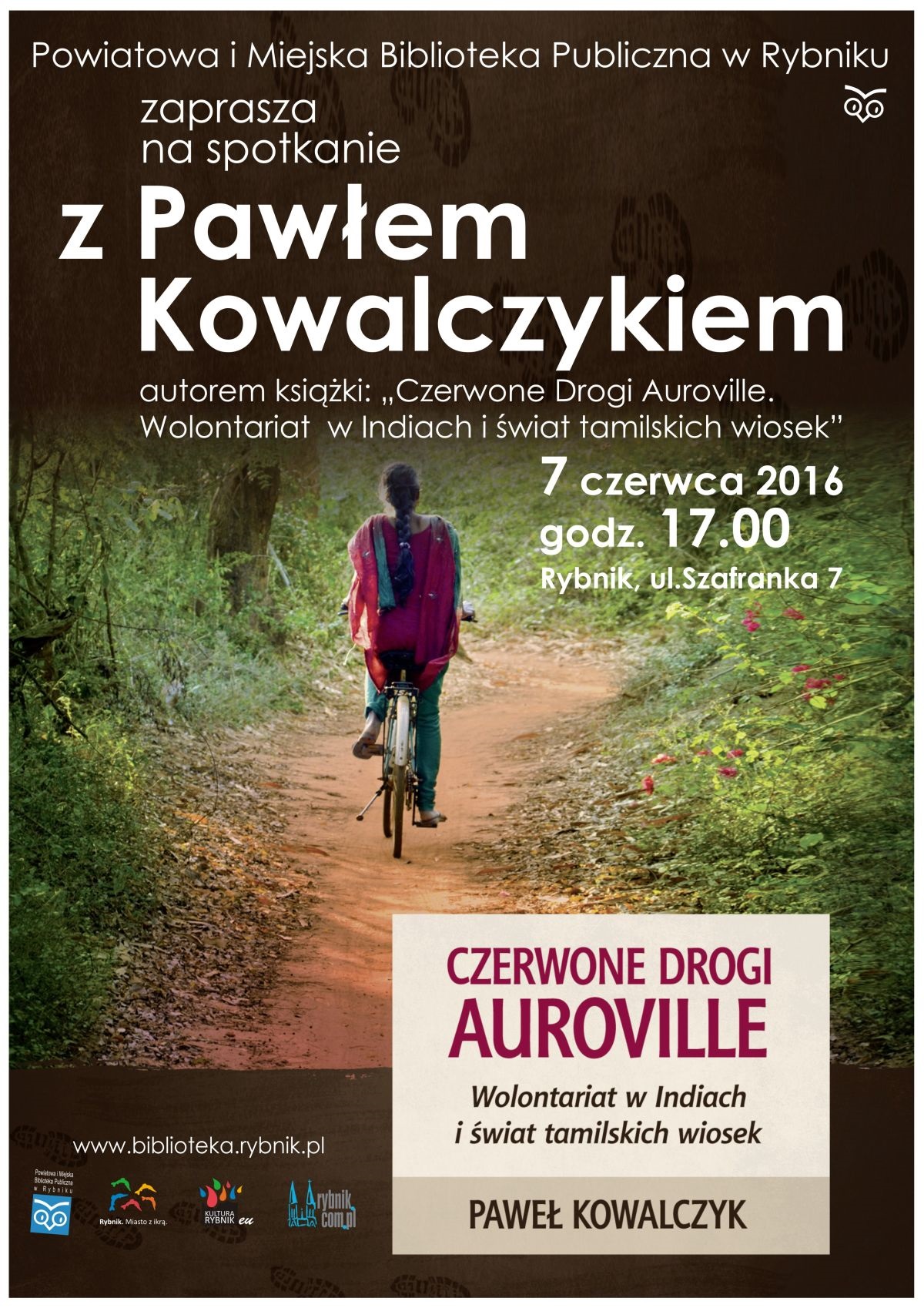 Powiatowa i Miejska Biblioteka Publiczna w Rybniku zaprasza na spotkanie autorskie z Pawłem Kowalczykiem, podróżnikiem, autorem książki „Czerwone Drogi Auroville. Wolontariat w Indiach i świat tamilskich wiosek”. Spotkanie odbędzie się we wtorek 7 czerwca o godz. 17:00 w Bibliotece Głównej przy ul. Szafranka 7.