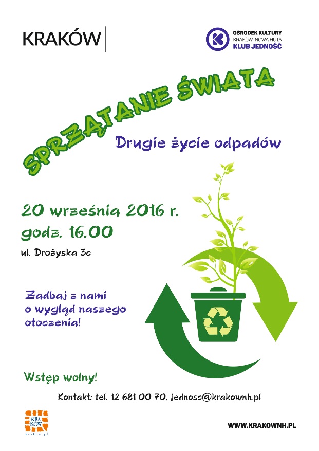 20.09. GODZ. 16.00, SPRZĄTANIE ŚWIATA Klub Jedność Ośrodka Kultury Kraków-Nowa Huta (ul. Drożyska 3c) Sprzątanie Świata to coroczna akcja Klubu Jedność Ośrodka Kultury Kraków-Nowa Huta w której mogą wziąć udział wszyscy, którym nie jest obojętny los i wygląd okolicy.