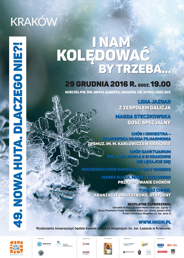 29 grudnia o godz. 19.00 w kościele p.w. św. Brata Alberta na os. Dywizjonu 303 rozpocznie się 49. koncert Nowa Huta. Dlaczego Nie?! zatytułowany I nam kolędować by trzeba… W ten szczególny czas, do którego tęskni wielu przez cały rok – między innymi właśnie ze względu na tradycję kolędowania – trzeba na nowo odkrywać bogactwo treści kryjące się w tekstach kolęd i pastorałek. W tym roku przypomną je nam: gość specjalny - Magda Steczkowska oraz Lidia Jazgar z zespołem Galicja, dla których będzie to koncert wieńczący jubileuszowy rok 30-lecia pracy artystycznej. Towarzyszyć im będą Chór i Orkiestra - Krakowska Młoda Filharmonia ZPSMuz. im. M. Karłowicza w Krakowie, Chór Sanktuarium św. Jana Pawła II w Krakowie Nie lękajcie się! oraz Bocheński Chór Kameralny Salt Singers. Za przygotowanie chórów odpowiedzialni są Marek Kluza i Maciej Kozłowski, a autorem aranżacji orkiestrowych i dyrygentem koncertu będzie Tomasz Chmiel. Koncert poprowadzi jak zawsze – Lidia Jazgar. Zgromadzeni będą mogli wysłuchać i zaśpiewać z artystami znane i lubiane kolędy a Galicja zaprezentuje także swoje autorskie piosenki świąteczne.