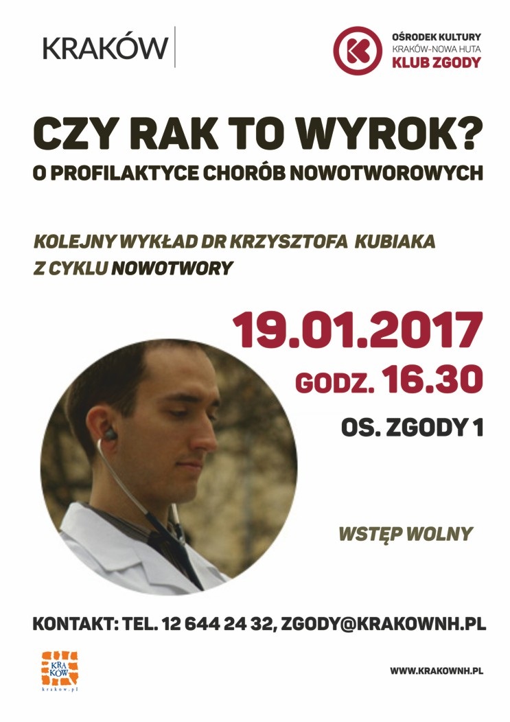 19.01. GODZ. 16.30, CZY RAK TO WYROK, CZYLI O PROFILAKTYCE CHORÓB NOWOTWOROWYCH Klub Zgody Ośrodka Kultury Kraków-Nowa Huta (os. Zgody 1)