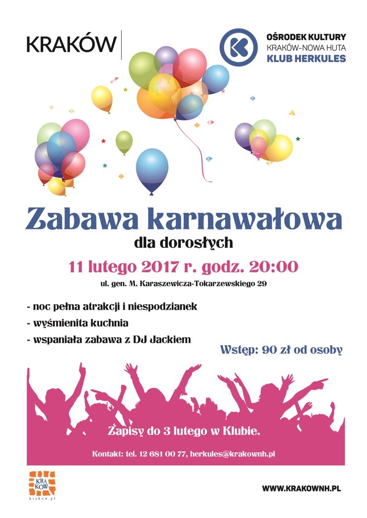 11.02. GODZ. 20.00 ZABAWA KARNAWAŁOWA DLA DOROSŁYCH Klub Herkules Ośrodka Kultury Kraków-Nowa Huta (ul. gen. M. Karaszewicza-Tokarzewskiego 29)