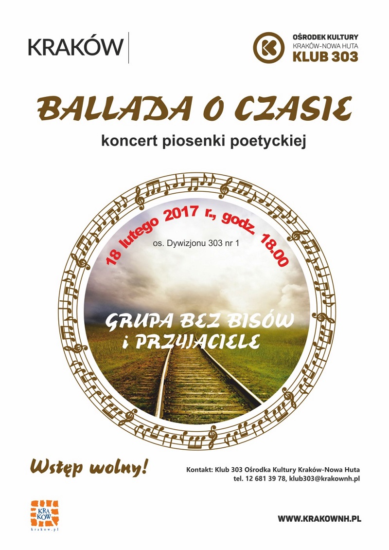 18.02. GODZ. 18.00, BALLADA O CZASIE – KONCERT Klub 303 Ośrodka Kultury Kraków-Nowa Huta (os. Dywizjonu 303 nr 1)