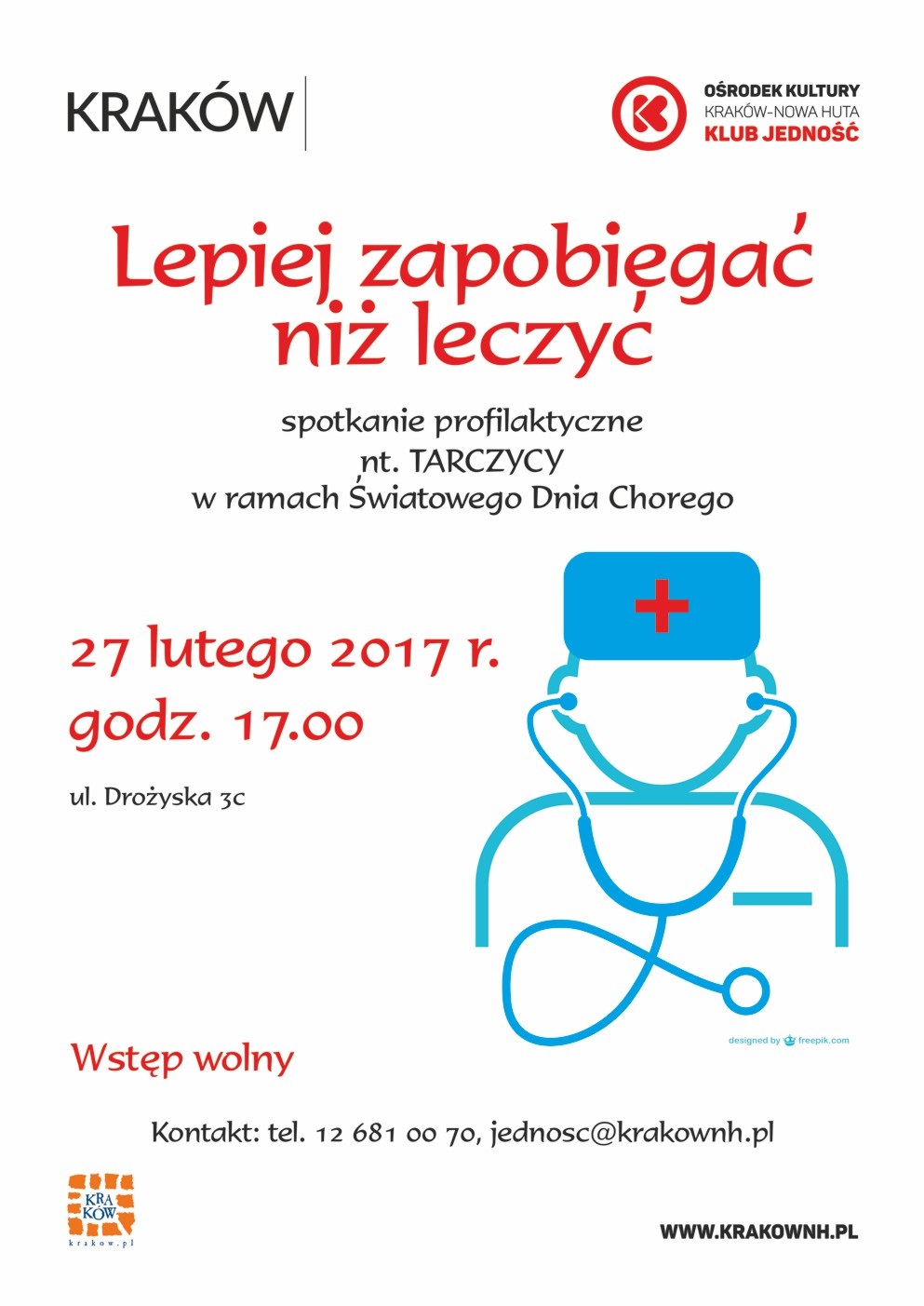 27.02. GODZ. 17.00, LEPIEJ ZAPOBIEGAĆ NIŻ LECZYĆ - TARCZYCA. Klub Jedność Ośrodka Kultury Kraków-Nowa Huta (ul. Drożyska 3c)