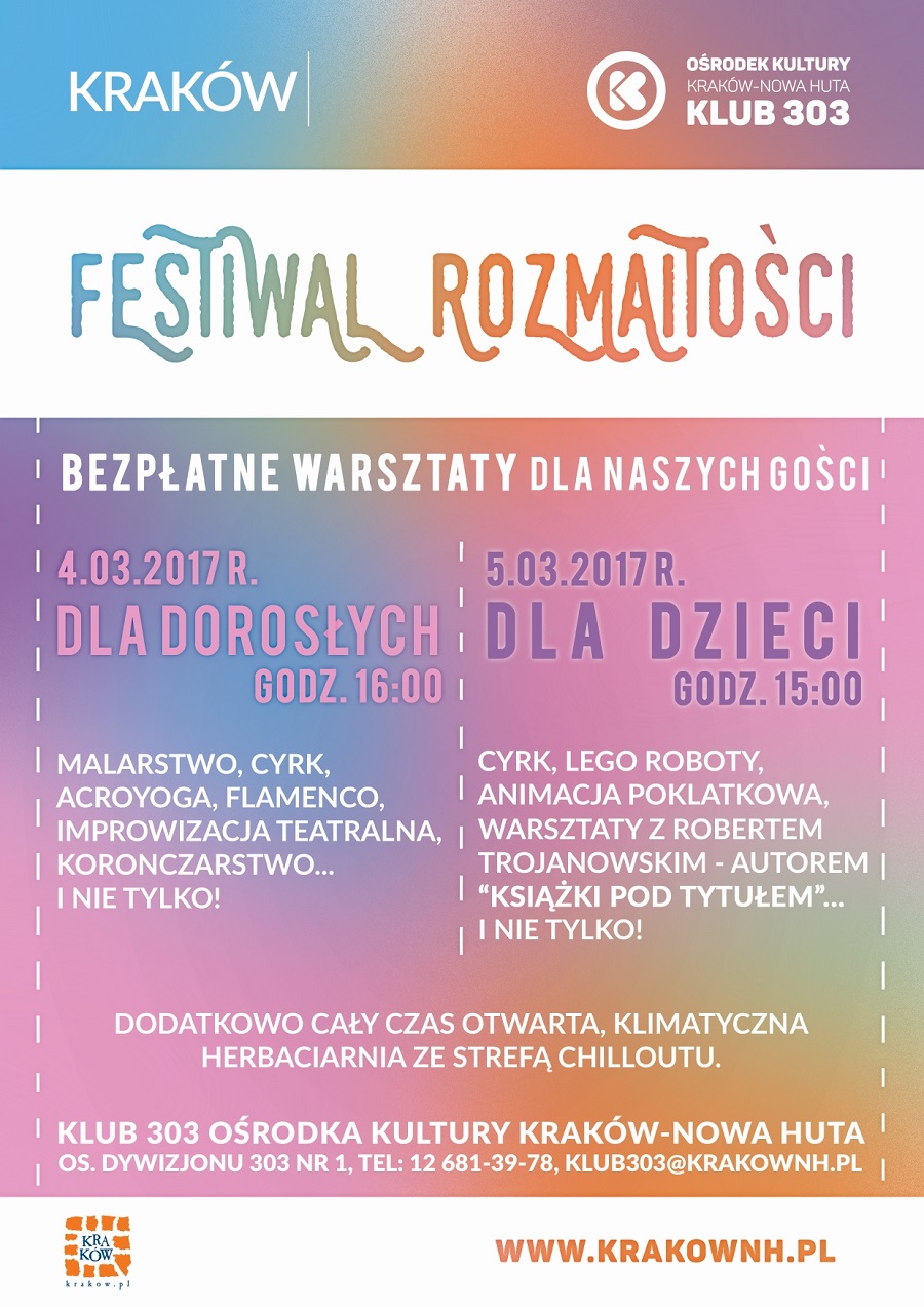 1, 2, 3, 4… i 5! Jeden Klub, dwa dni, trzy bloki warsztatowe, cztery cieszące się dużym zainteresowaniem odsłony w poprzednich latach. Przed nami piąta edycja Festiwalu Rozmaitości i pięć godzin nietypowych i niedostępnych nigdzie indziej w Nowej Hucie warsztatów.