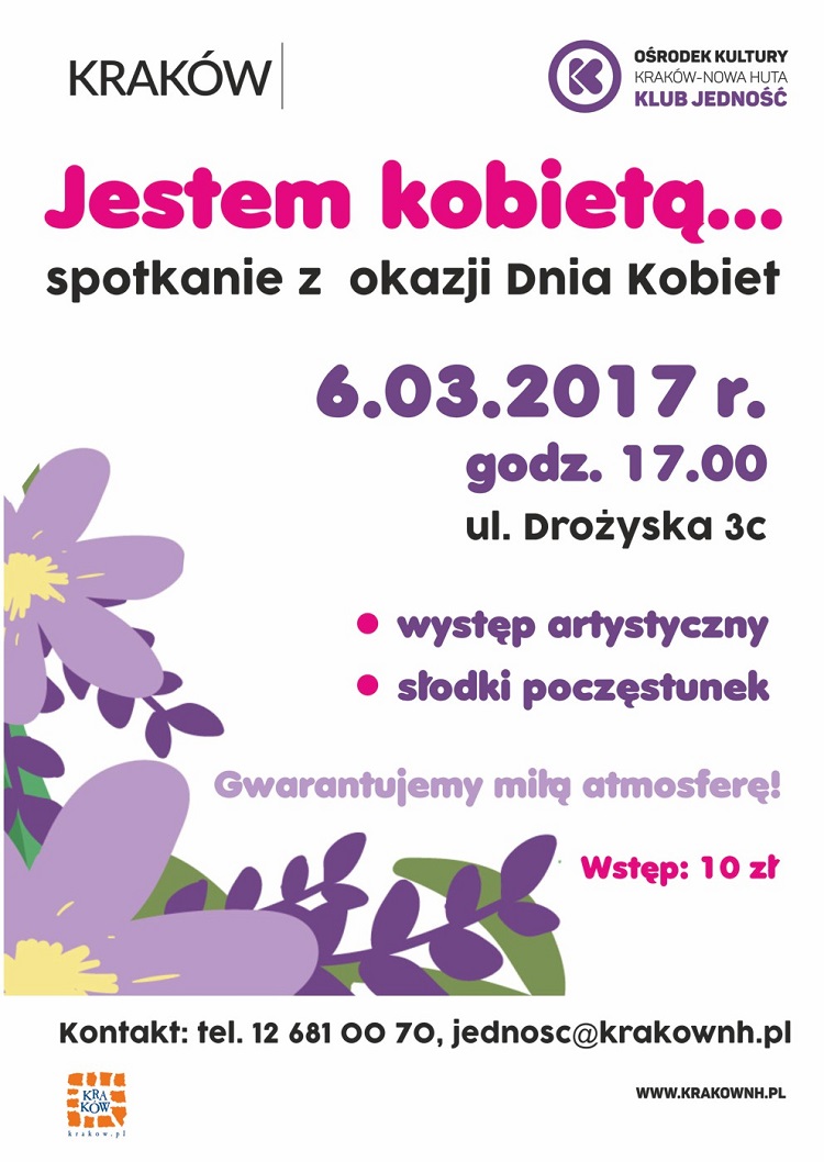 Jako hasło przewodnie tegorocznego Dnia Kobiet organizatorzy wybrali słowa piosenki Edyty Górniak: Jestem kobietą- jestem dobrem, jestem złem, jestem wodą, jestem ogniem, jawą i snem..., ponieważ wszystkie te emocje kobiety odnajdują w sobie. Taka jest kobieca natura, ale czy to źle? Kobieta jest podobno arcydziełem wszechświata - i tego się trzymajmy. Klub Jedność Ośrodka Kultury Kraków-Nowa Huta zaprasza wszystkie panie na program artystyczny w wykonaniu Radosława Omiecińskiego, który odpowie na pytanie: czy mężczyźni dopiero 8 marca dostrzegają swoje kobiety? Miła atmosfera oraz wiele przyjemności dla ducha i ciała gwarantowane!