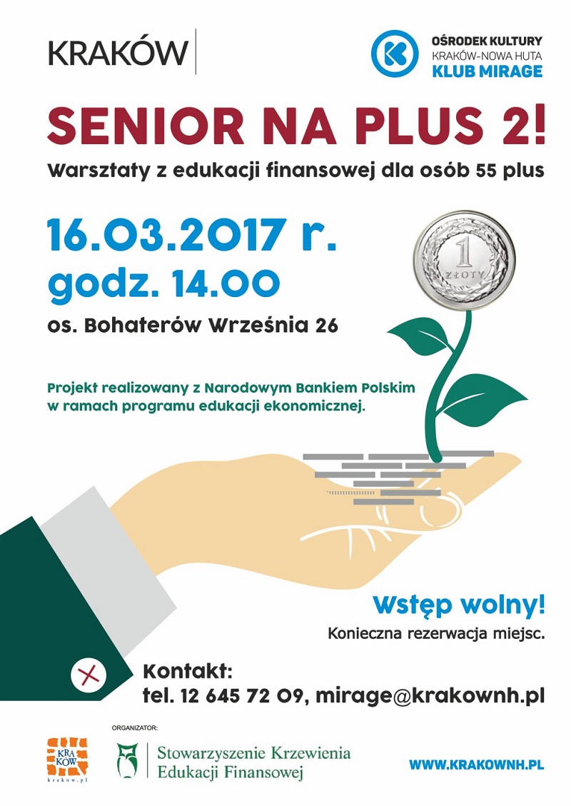 16.03. GODZ. 14.00, SENIOR NA PLUS 2! WARSZTATY Z EDUKACJI FINANSOWEJ DLA OSÓB 55+ Klub Mirage Ośrodka Kultury Kraków-Nowa Huta (os. Bohaterów Września 26)