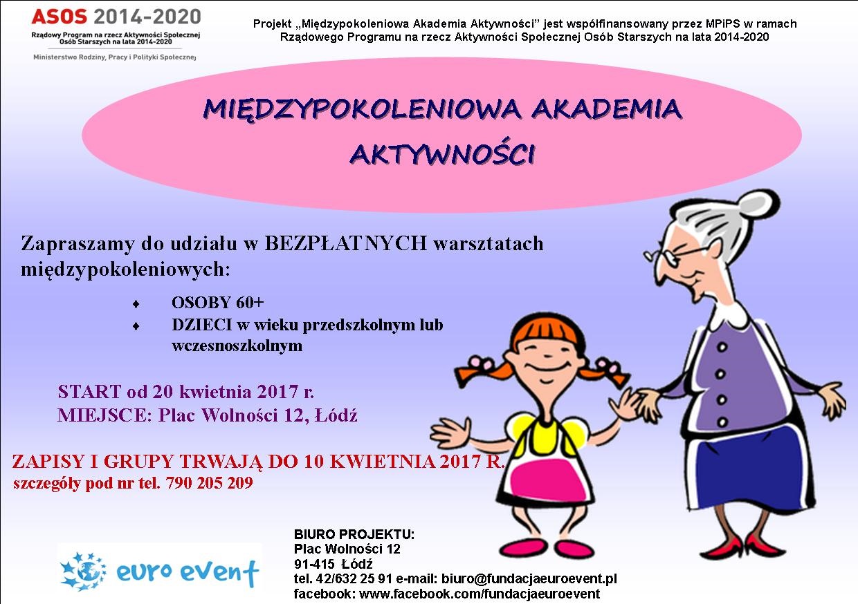 Fundacja Euro Event ma przyjemność zaprosić wszystkie osoby w wieku 60+ do udziału w BEZPŁATNYCH międzypokoleniowych warsztatach realizowanych w ramach programu ASOS.