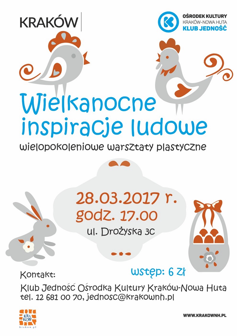 28.03. GODZ. 17.00, Wielkanocne inspiracje ludowe. Klub Jedność Ośrodka Kultury Kraków-Nowa Huta (ul. Drożyska 3c) zaprasza 28.03. o godz. 17.00 na spotkanie Wielkanocne inspiracje ludowe.