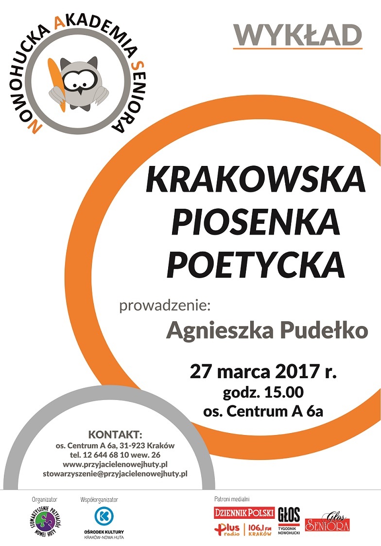 27.03. GODZ. 15.00, Wykład: Krakowska Piosenka Poetycka Nowohucka Akademia Seniora (os. Centrum A 6a)