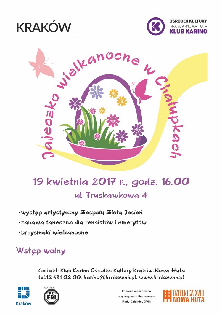 Jajeczko Wielkanocne w Chałupkach to jedna z imprez okolicznościowych organizowana dla emerytów i rencistów zrzeszonych w PZERiI. Impreza ta corocznie organizowana jest w innym klubie Ośrodka Kultury Kraków – Nowa Huta. Tym razem gospodarzem Jajeczka Wielkanocnego będzie Klub Karino. Program artystyczny wykona gościnnie Zespół Złota Jesień. Impreza realizowana przy wsparciu finansowym Rady Dzielnicy XVIII.