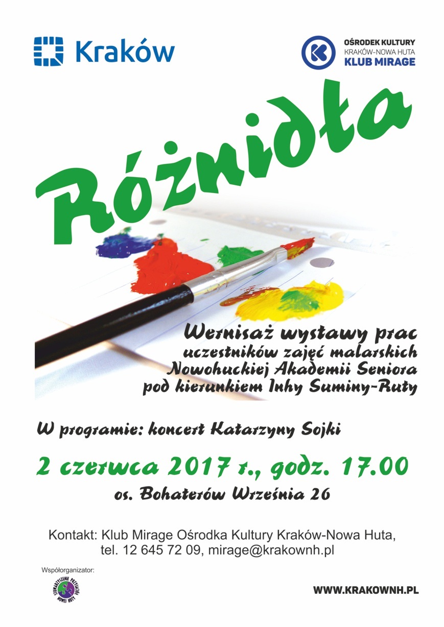 Wernisaż wystawy malarstwa i rysunku uczestników zajęć prowadzonych przez artystkę, malarkę Inhę Sumina-Ruta w ramach Nowohuckiej Akademii Seniora organizowanej przez Stowarzyszenie Przyjaciół Nowej Huty i Ośrodek Kultury Kraków-Nowa Huta. Na wystawie swoje prace zaprezentują: Krystyna Eminowicz, Grażyna Brożek, Małgorzata Lasota, Anna Białowąs, Swietlana Morgun-Graniewska oraz Jolanta Stępień. Na obrazach zobaczymy pejzaże, martwe natury, portrety oraz kopie obrazów znanych malarzy. Wystawę można oglądać do końca października.