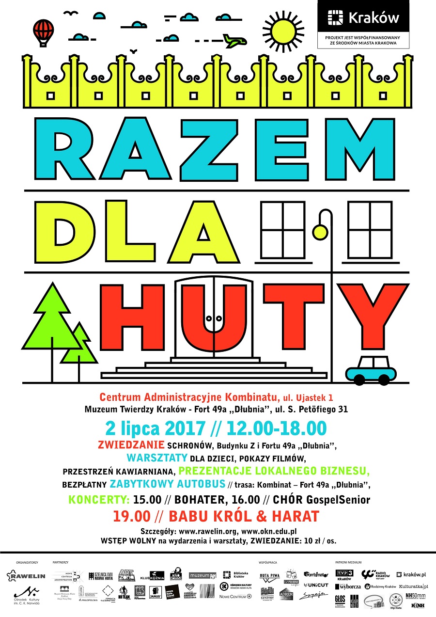 wspólnie z innymi nowohuckimi instytucjami kultury, organizacjami pozarządowymi, grupami nieformalnymi i lokalnym biznesem organizują wydarzenie Razem dla Huty. 2 lipca 2017 r. w Centrum Administracyjnym Kombinatu (ul. Ujastek 1) oraz w Muzeum Twierdzy Kraków – Forcie 49a „Dłubnia” (ul. Petöfiego 31) przygotowano moc atrakcji dla dużych i małych! Start o godz. 12.00.