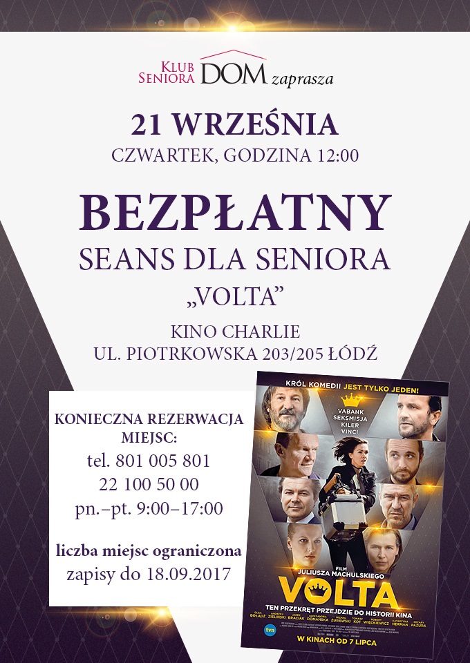 Oczywiście pytanie: idziemy do kina czy na film? Jednego możemy być pewni - najnowsza komedia Juliusz Machulskiego „VOLTA” zapewni dawkę dobrego, polskiego kina. Bezpłatny pokaz filmowy zagwarantuje seniorom z Łodzi popołudnie pełne emocji w ramach programu „Kino dla Seniora”, Klubu Seniora DOM.
