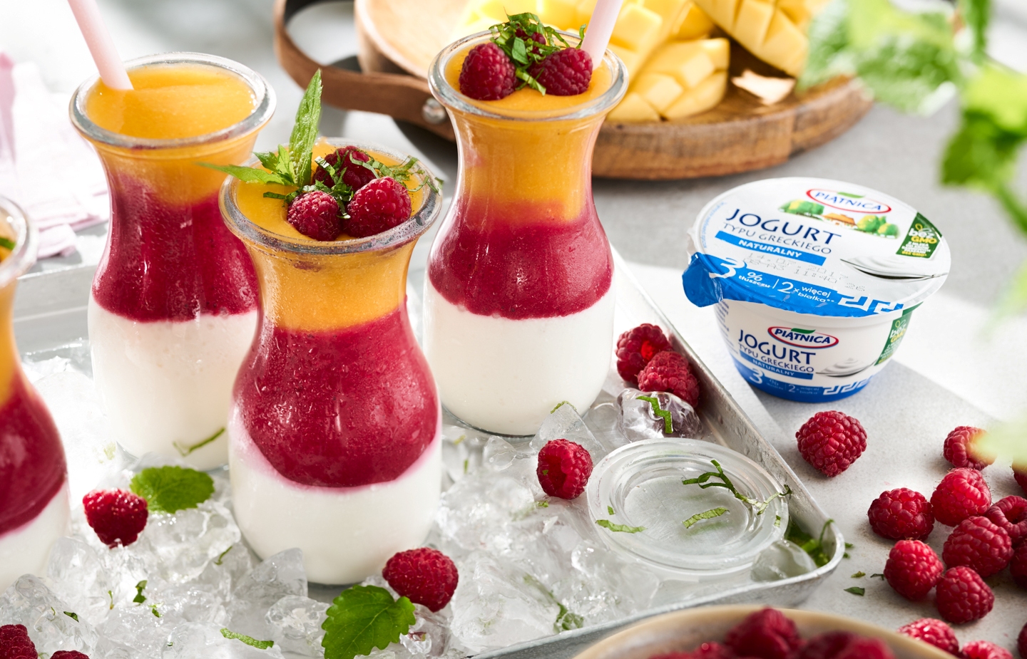 Zmiksować maliny i mango na mus. Jogurt wymieszać z syropem imbirowym. Przelewać warstwami do szklanego naczynia.
