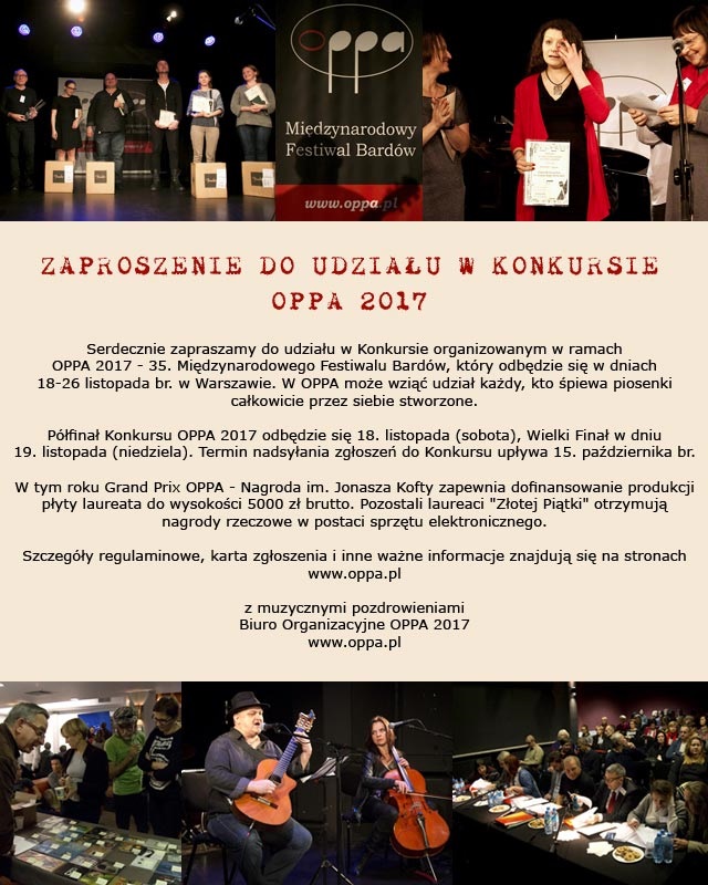 Półfinał Konkursu OPPA 2017 odbędzie się 18. listopada (sobota), Wielki Finał w dniu 19 . listopada (niedziela). Termin nadsyłania zgłoszeń do Konkursu upływa 15. października br .