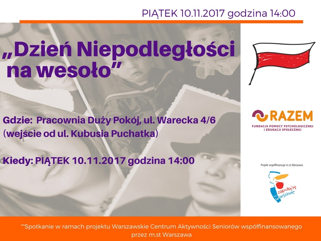 10.11 (piątek) – Pracownia Duży Pokój, ul. Warecka 4/6 (wejście od ul. Kubusia Puchatka), godziny:14:00-17:00. „Dzień Niepodległości na wesoło” - Spotkanie z okazji Dnia Niepodległości poświęcone skupieniu się na sukcesach Polski i Polaków na tle innych krajów. W planie krótkie wykłady o znanych Polakach, naszych zaletach i osiągnięciach. (Spotkanie w ramach Centrum Inicjatyw Wolontariackich Warszawskiego Centrum Aktywności Seniorów)