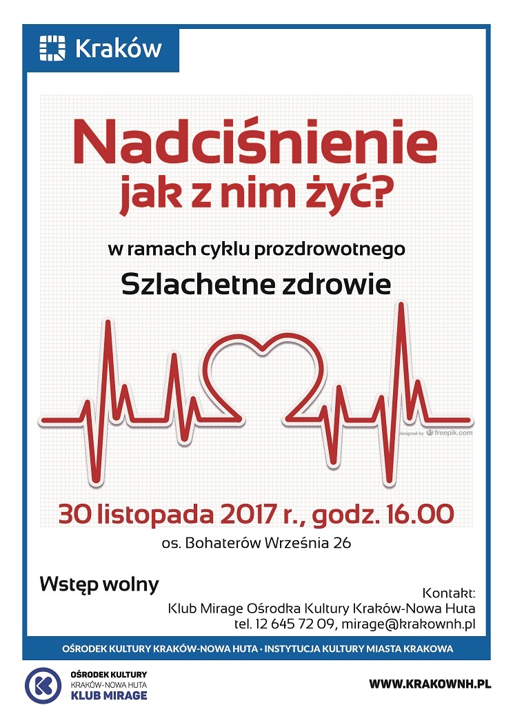 Szlachetne zdrowie to cykl wykładów i warsztatów z zakresu edukacji prozdrowotnej dotyczących najczęstszych chorób i ich profilaktyki. Głównym celem warsztatów będzie przekazanie praktycznych informacji: w czym tkwi istota schorzenia, jak się przed nim uchronić i jak monitorować swój stan zdrowia. Na listopadowym spotkaniu poruszony zostanie temat nadciśnienia - choroby, która zyskała niechlubne miano cichego zabójcy.