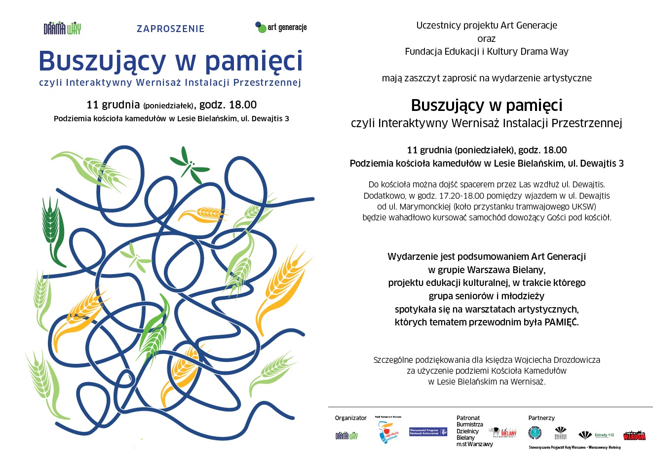 IV edycji międzypokoleniowego projektu ART GENERACJE, przygotowany przez grupę Warszawa - Bielany. Wernisaż zatytułowany Buszujący w pamięci odbędzie się 11 grudnia od godziny 18 w podziemiach Kościoła Kamedułów w Lesie Bielańskim, ul. Dewajtis 3.