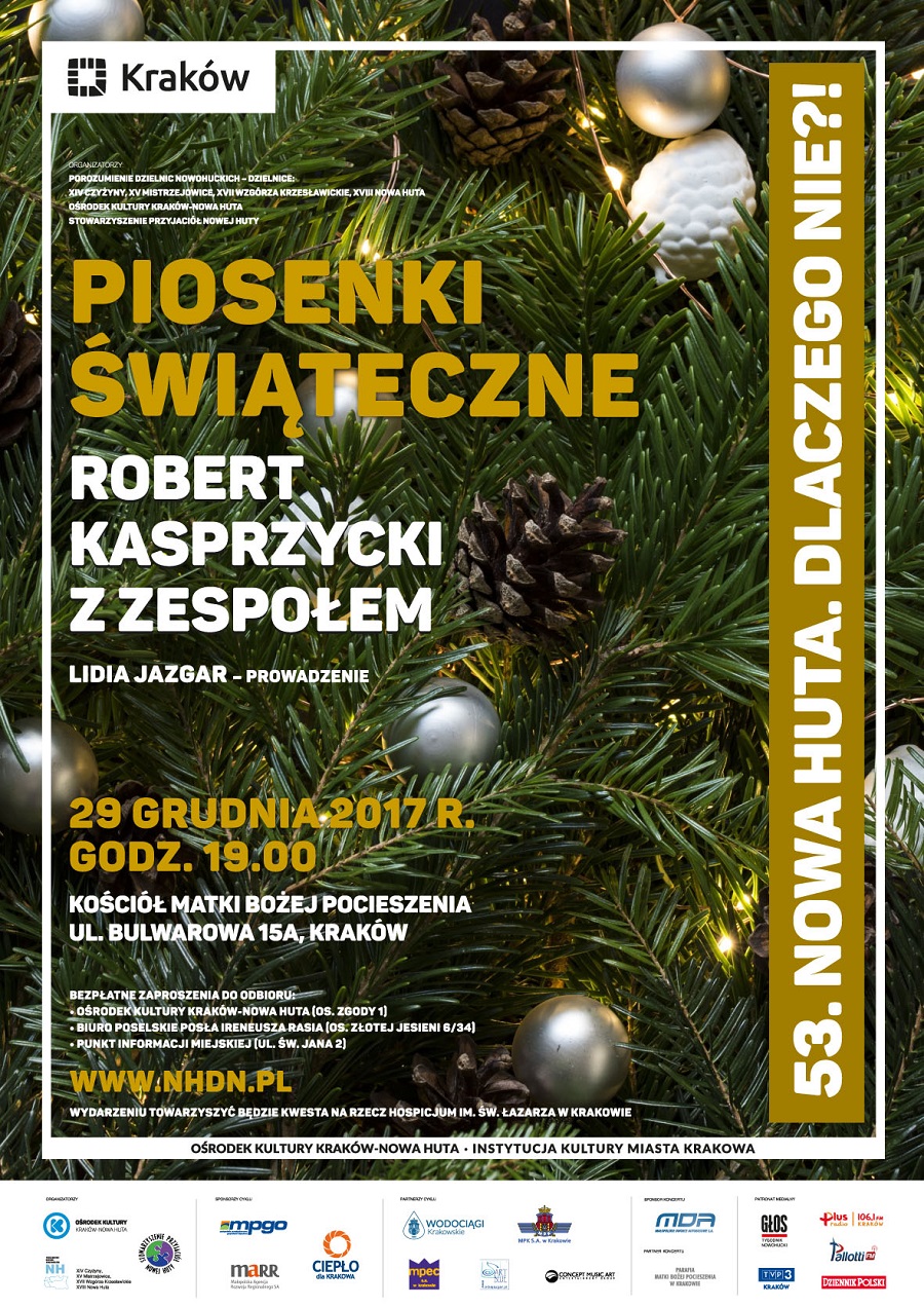 Organizatorzy cyklu: Porozumienie Dzielnic Nowohuckich - Dzielnice: XIV Czyżyny, XV Mistrzejowice, XVII Wzgórza Krzesławickie, XVIII Nowa Huta, Ośrodek Kultury Kraków-Nowa Huta oraz Stowarzyszenie Przyjaciół Nowej Huty zapraszają mieszkańców Krakowa na koncert bożonarodzeniowy pt. „Piosenki świąteczne” w wykonaniu Roberta Kasprzyckiego z zespołem w składzie: Maks Szelęgiewicz, Krzysztof Wyrwa i Adam Zadora. Wyjątkowa atmosfera tego muzycznego wieczoru znajdzie swoje odbicie w specjalnym repertuarze, składającym się z kolęd, pastorałek oraz piosenek autorskich dotyczących zimy. Uczestnicy posłuchają m.in. utworów takich jak: Zimowa Baśń, Kay i Gerda, Zadymka, Postój zimowy czy Zapiszę śniegiem w kominie. Koncerty Roberta Kasprzyckiego gwarantują niezapomniane przeżycia. W tym wypadku słuchacze, oprócz walorów czysto artystycznych, otrzymają możliwość wspólnego i radosnego śpiewania kolęd wraz z artystą. Wydarzenie poprowadzi Lidia Jazgar.