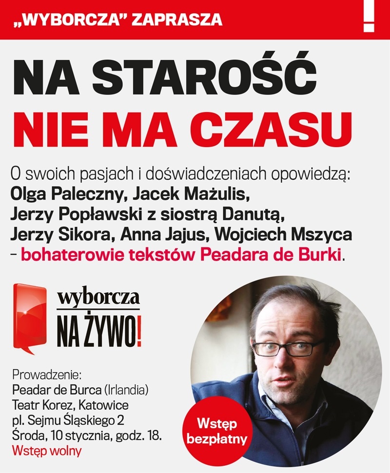 W spotkaniu „Na starość nie ma czasu” weźmie udział sześciu seniorów, którzy byli bohaterami artykułów Peadara de Burki, publikowanych na łamach katowickiej „Gazety Wyborczej”. Mieszkający na Śląsku Irlandczyk wypytywał starszych ludzi o ich życie i receptę na pogodę ducha.