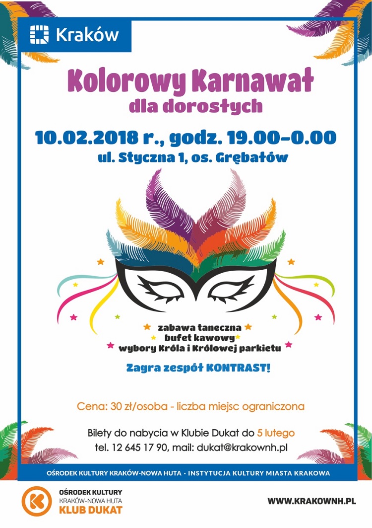 Kolorowy Karnawał dla Dorosłych będzie wieczorem pełnym dobrej zabawy, szalonego tańca oraz dobrego humoru. Dla uczestników zabawy zagra zespół Kontrast, który mieszkańcy znają i dobrze wspominają już z zabawy andrzejkowej. Do dyspozycji gości będzie bufet kawowy.