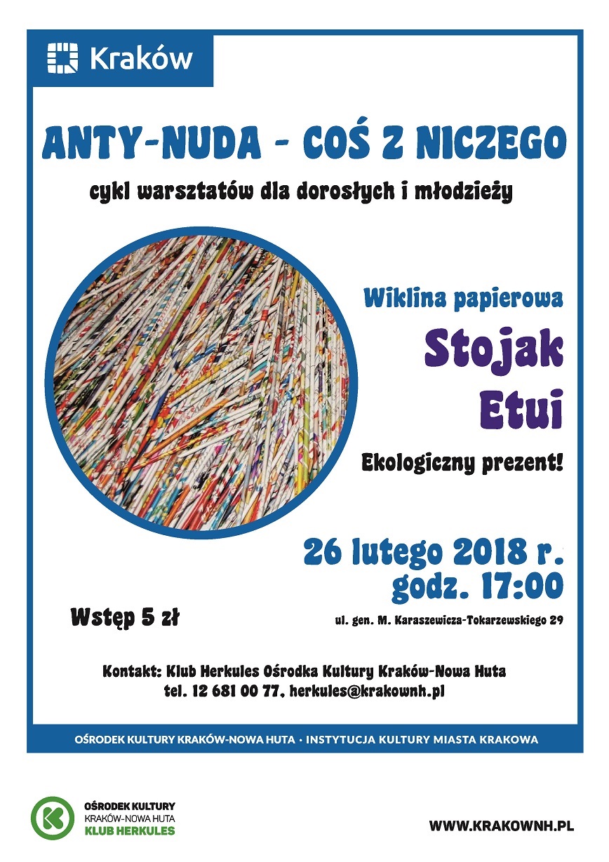Klub Herkules Ośrodka Kultury Kraków-Nowa Huta (ul. Gen. M. Karaszewicza-Tokarzewskiego 29) zaprasza na kolejne warsztaty dla dorosłych i młodzieży z cyklu Anty-nuda – coś z niczego w poniedziałek 26 lutego 2018 r. o godz. 17.00.