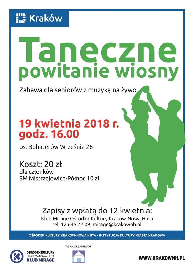 Taniec sprzyja integracji i zdobywaniu nowych znajomości, pobudza krążenie i poprawia humor - zwłaszcza przy znanych i lubianych melodiach. Okazję, by się to tym przekonać będą mieli seniorzy podczas zorganizowanego dla nich w Klubie Mirage wieczorku tanecznego. To już kolejna edycja imprezy, tym razem organizowanej pod hasłem „Taneczne powitanie wiosny”.