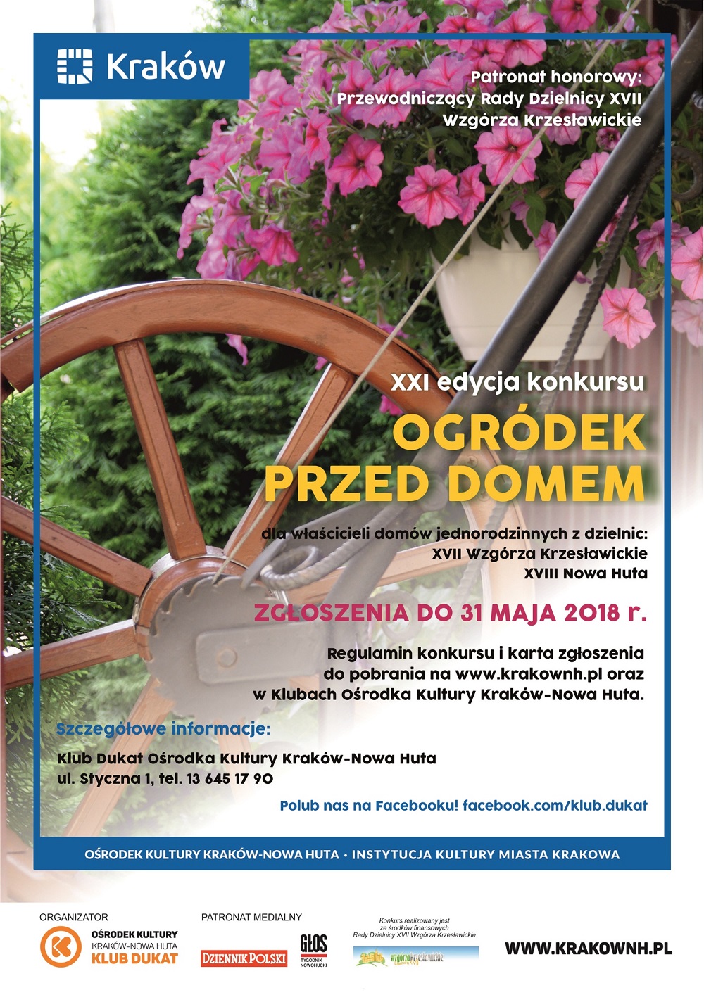 Piękne przydomowe ogródki to nie tylko radość dla właścicieli i ich znajomych, ale wymierne korzyści dla lokalnych społeczności. Zieleń obniża zanieczyszczenie powietrza, uwrażliwia na piękno, uczy dbałości o najbliższe otoczenie i przyrodę. Najwspanialsze aranżacje przyrodnicze oraz ich autorzy godni są wyróżniania i nagradzania, dlatego od ponad dwóch dekad Klub Dukat Ośrodka Kultury Kraków-Nowa Huta organizuje, przy wsparciu Rady Dzielnicy XVII Wzgórza Krzesławickie, konkurs OGRÓDEK PRZED DOMEM, którym promuje „zielone” rozwiązania dekoratorskie oraz pomysłowość ich twórców. Patronat nad konkursem sprawuje Stanisław Madej – Przewodniczący Rady i Zarządu Dzielnicy XVII.