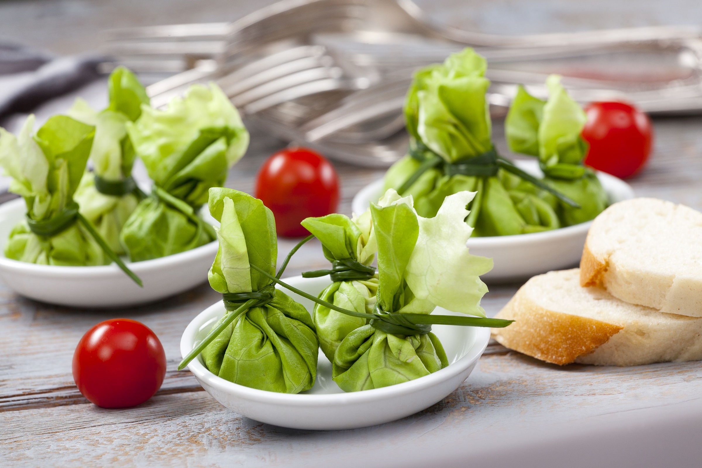 Sałaty myjemy, dokładnie osuszamy liście – większe dzielimy na pół. Formujemy z nich kieszonki, w które nakładamy pastę połączoną z wędzonym twarogiem. Gotowe kieszonki przewiązujemy szczypiorkiem i układamy na talerzu.