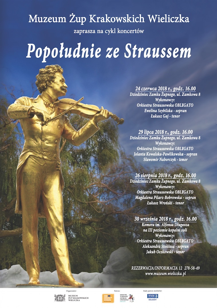 Muzeum Żup Krakowskich Wieliczka zaprasza na drugi, letni koncert z cyklu „Popołudnie ze Straussem” 29 lipca (niedziela) 2018 r., godz. 16.00 w Zamku Żupnym w Wieliczce. Wykona go Orkiestra Straussowska OBLIGATO pod dyrekcją Jerzego Sobeńko oraz soliści: Jolanta Kowalska-Pawlikowska – sopran i Sławomir Naborczyk – tenor.