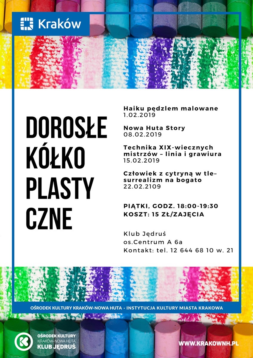Wielobarwne dzieła mistrza Henri'ego, kwiatowa ekspresja van Gogha, malarska jazda w stylu amerykańskim, odwieczna walka kółka i kwadratu a abstrakcjoniści – to nie tematy szalonych sporów i nocnych dysput w gronie artystycznej bohemy, ale plastyczny opis artystycznych inspiracji, którymi kierują się uczestnicy autorskich zajęć, prowadzonych przez związaną z Nową Hutą artystkę-malarkę Joannę "Lolę" Styrylską-Gałażyn. Mieszkańcy dzielnicy w każdy piątkowy wieczór spotykają się w Klubie Jędruś Ośrodka Kultury Kraków-Nowa Huta (os. Centrum A 6a), by zgłębiać tajniki sztuki, przekraczać niewiarę we własne zdolności plastyczne i próbować się w roli artysty, a czasem po prostu dowiedzieć się i spróbować czegoś nowego w życiu.