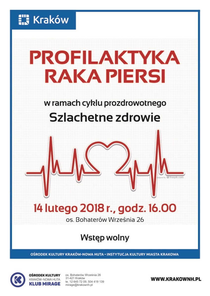 Wykład poświęcony profilaktyce raka piersi. Obecnie to najczęściej występujący u Polek nowotwór złośliwy. Zagraża szczególnie kobietom powyżej 50. roku życia, ale młodsze panie również powinny mieć się przed nim na baczności. Podczas spotkania omówione zostaną formy zapobiegania chorobie, metody jej diagnozowania oraz sposoby leczenia. Wykład odbędzie się w ramach projektu realizowanego przez Krakowski Szpital Specjalistyczny im. Jana Pawła II w Krakowie pn. „Zrób mammografię dla siebie i swoich bliskich!” współfinansowanego z Europejskiego Funduszu Społecznego w ramach Regionalnego Programu Operacyjnego Województwa Małopolskiego na lata 2014-2020. Spotkanie poprowadzi Katarzyna Olbrych - pomysłodawczyni i koordynatorka projektu.